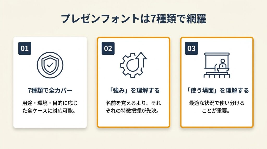 7種類を把握しておけば、用途・環境・目的に応じたすべてのケースをカバーできます。フォント名を覚えることよりも、それぞれの「強み」と「使う場面」を理解することが先決です。