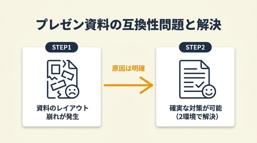 資料を送ったら先方の環境でレイアウトが崩れていた、というトラブルの原因は明確です。原因が特定できているため、対策も確実に打てます。