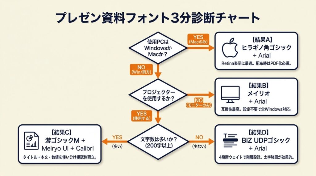 以下の3つの質問に答えるだけで最適なフォントが決まります。環境・投影方法・文字数の3軸で判断してください。