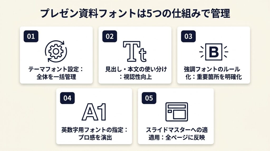 ▶ 今すぐやること: スライドマスターを開き、和文を游ゴシック Medium・欧文をArialに設定する(5分)。この1操作で本文内の全フォントが統一される