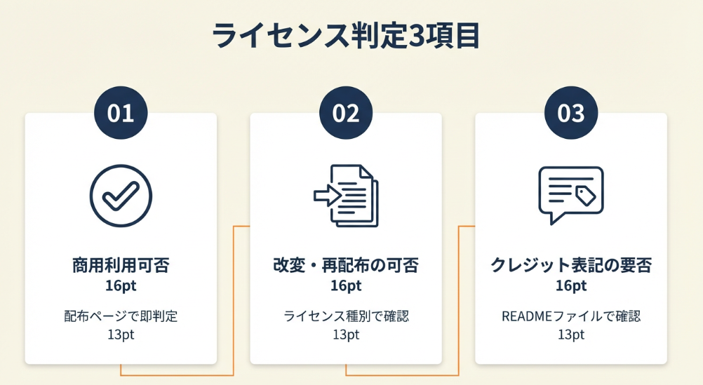 ライセンス確認は「商用利用可否」「改変・再配布の可否」「クレジット表記の要否」の3項目に絞れば、3分以内で判定できます。