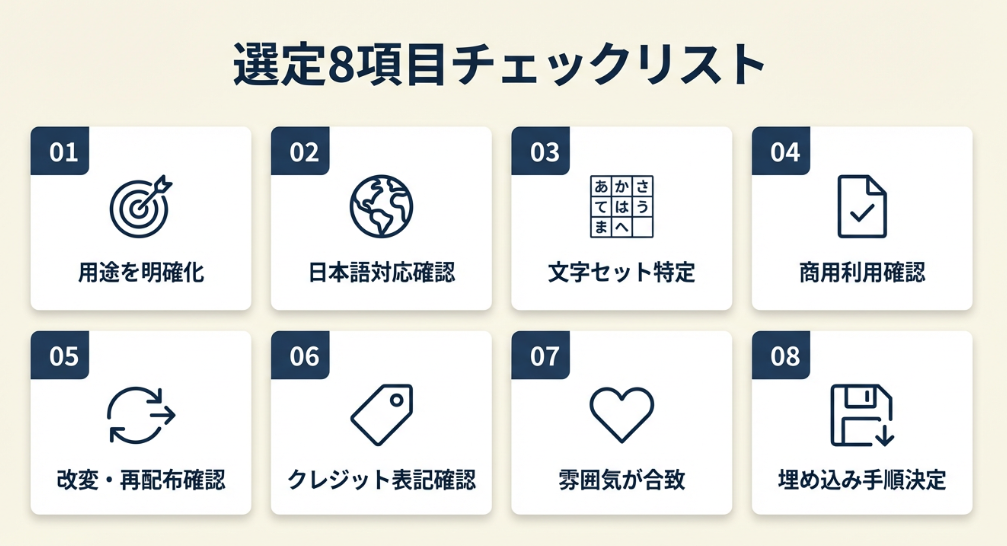 以下の8項目を順番に確認すれば、フォント選定で迷うことはなくなります。