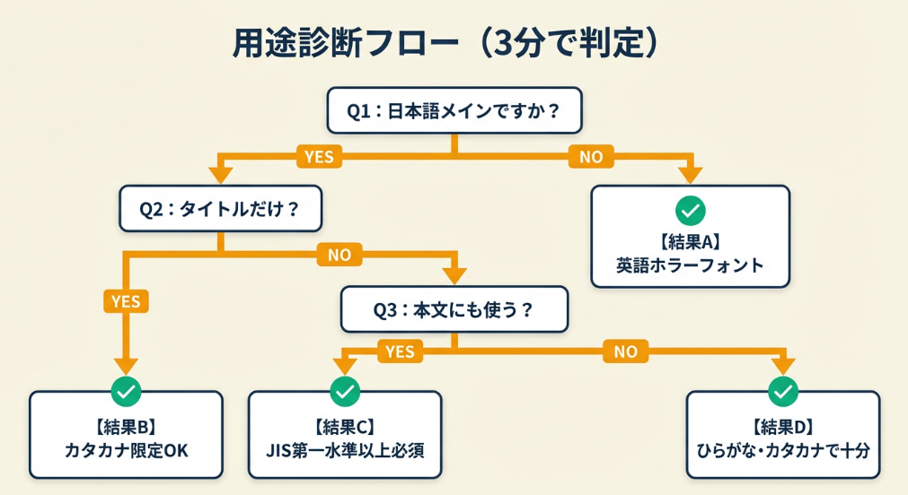• いいえ → 【結果D】ひらがな・カタカナ対応フォントで十分