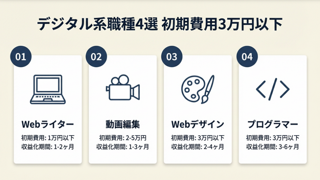 - 初期費用3万円以下で始められる職種と収益化までの期間