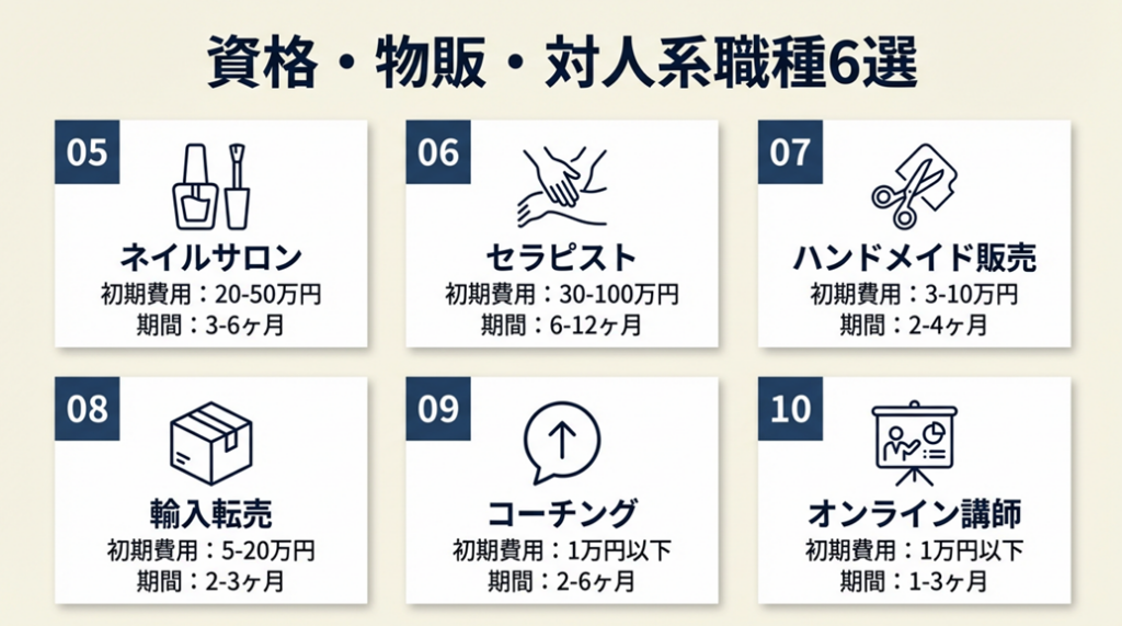 整体師・ネイリスト・ベビーシッターなど資格・技術系職種は、習得に3〜12か月かかる代わりに競合との差別化が明確です。ネイルサロンのホームサロン開業であれば初期費用20〜50万円、月売上30〜60万円が一般的な収益モデルです(国民生活産業・消費者団体連合会)。技術習得中の収入ゼロ期間が3〜6か月発生するため、生活費6か月分の貯蓄を確保した上で始めることが前提です。