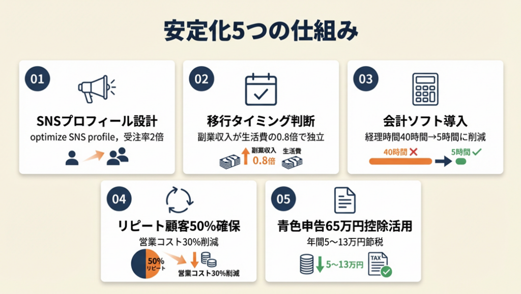 自営業の最大リスクは収入ゼロ期間です。生活費6か月分の確保を最優先にし、その間に副業で月3〜5万円の実績を積むことで、独立後の不安が大幅に軽減されます。