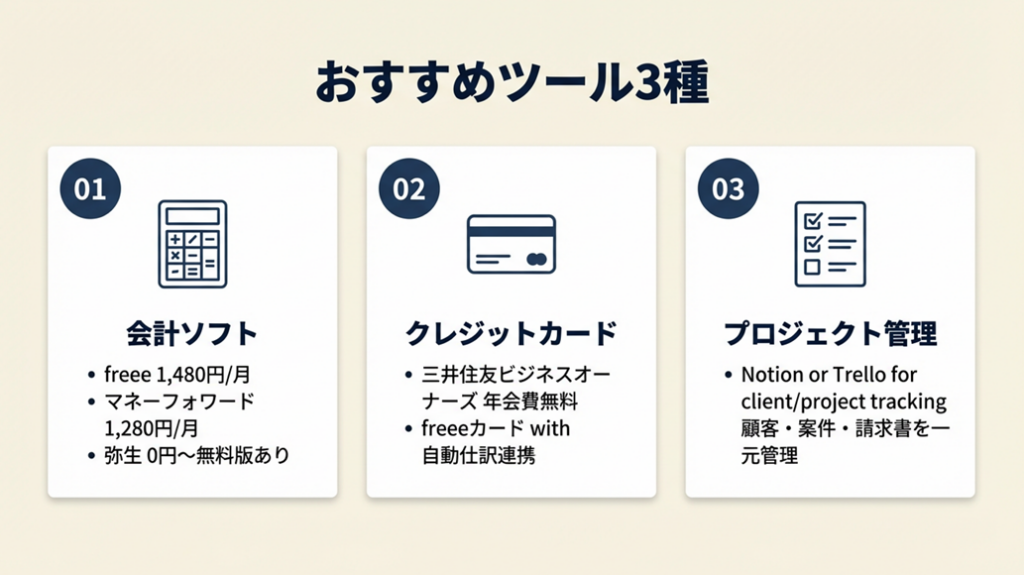 会計ソフト・クレジットカード・プロジェクト管理ツールの3種に絞ることで、開業初日から業務効率を最大化できます。ツール選びで時間を使いすぎると、その分だけ実際の仕事開始が遅れます。