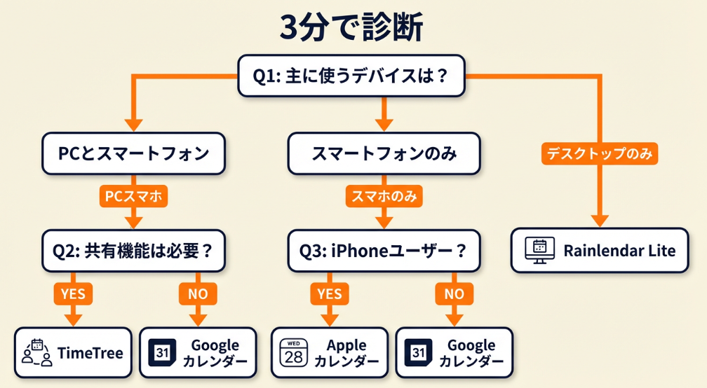 無料カレンダーアプリ選びで迷ったら、「自分の使い方に合っているか」を最優先に考えてください。PCとスマホの同期が必要か、家族・チームとの共有が必要か、デスクトップ常時表示が必要か。この3点を基準に選べば失敗しません。