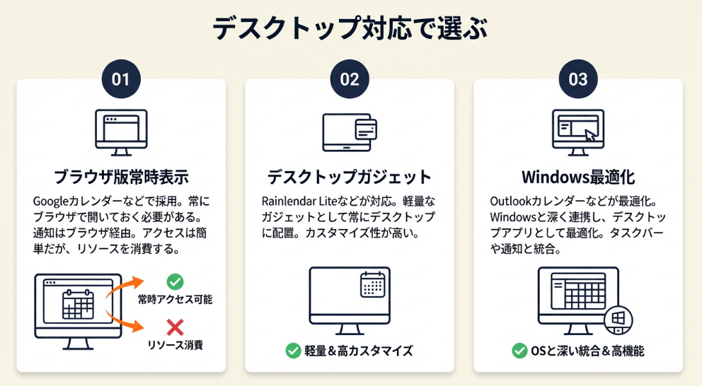 デスクトップPCでの作業が多い方にとって、カレンダーの常時表示は作業効率に直結します。ブラウザ版・デスクトップアプリ・ガジェット表示の3種類があり、それぞれ特徴が異なります。Googleカレンダーはブラウザ版のみ、Rainlendar Liteはガジェット表示、Outlookはデスクトップアプリに対応しています。