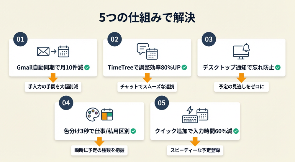 | 予定追加の手間を減らしたい | 無料カレンダーアプリ管理は5つの仕組みで解決 | 15分 |