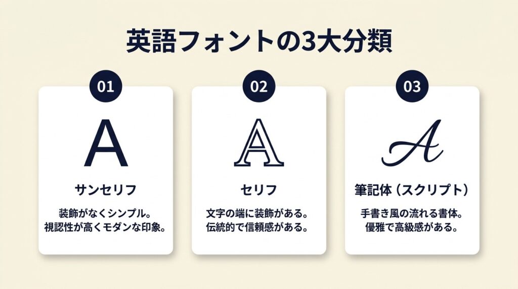 英語フォントは「サンセリフ」「セリフ」「筆記体(スクリプト)」の3種類に大別されます。この分類を知るだけで選択肢が劇的に絞り込まれます。