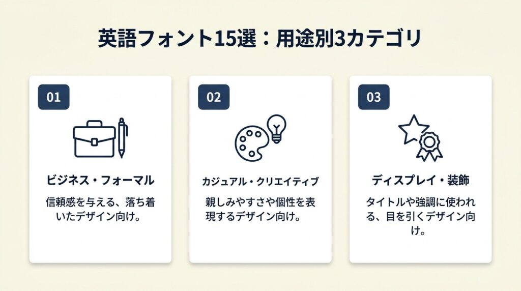 候補を5種類以下に絞った方が最終的に「使えるフォント」に早くたどり着けます。ここでは用途軸で厳選した15選を3カテゴリに分けて紹介します。