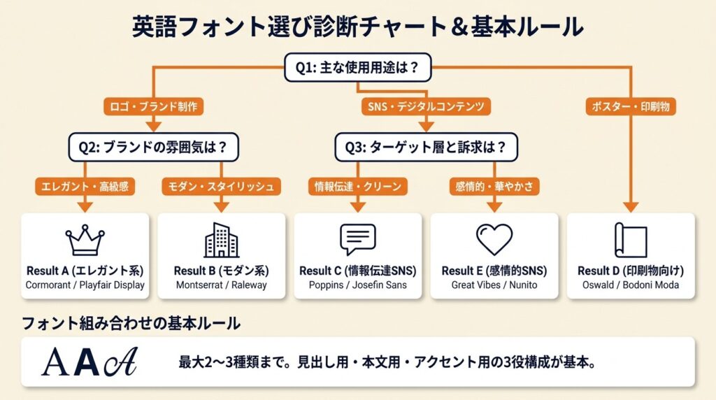 ロゴ・ブランド制作 → Q2へ進む。SNS・デジタルコンテンツ → Q3へ進む。ポスター・印刷物 →Result D(Oswald / Bodoni Moda)。