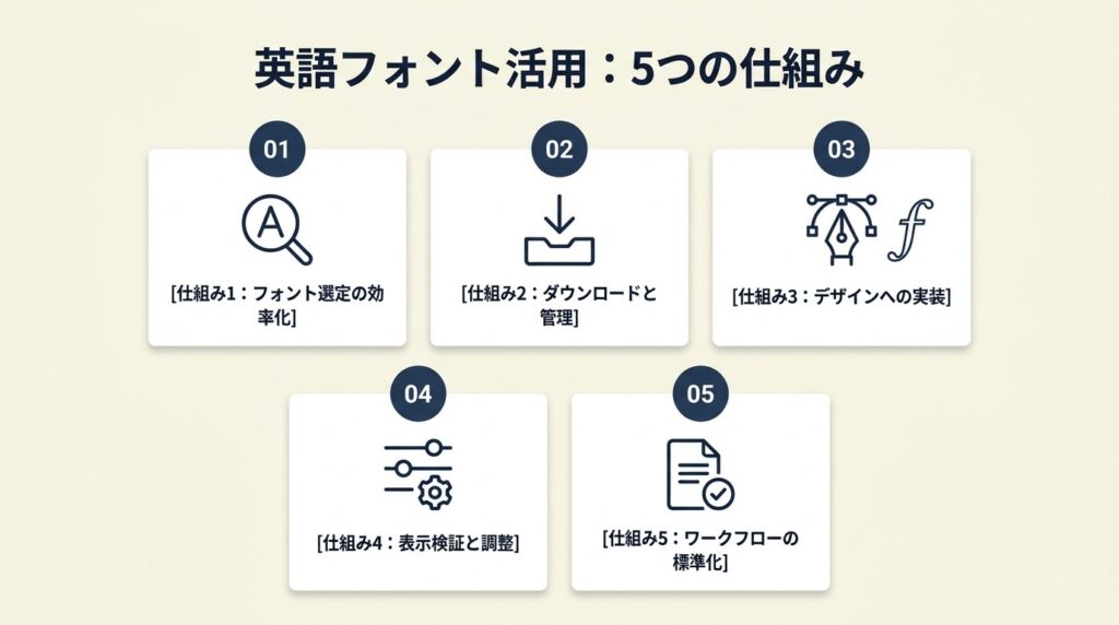 フォントをダウンロードするだけで終わらせず、実務デザインに組み込む仕組みを作ることがポイントです。以下の5つのハックで、選定から実装まで一貫したワークフローを構築できます。