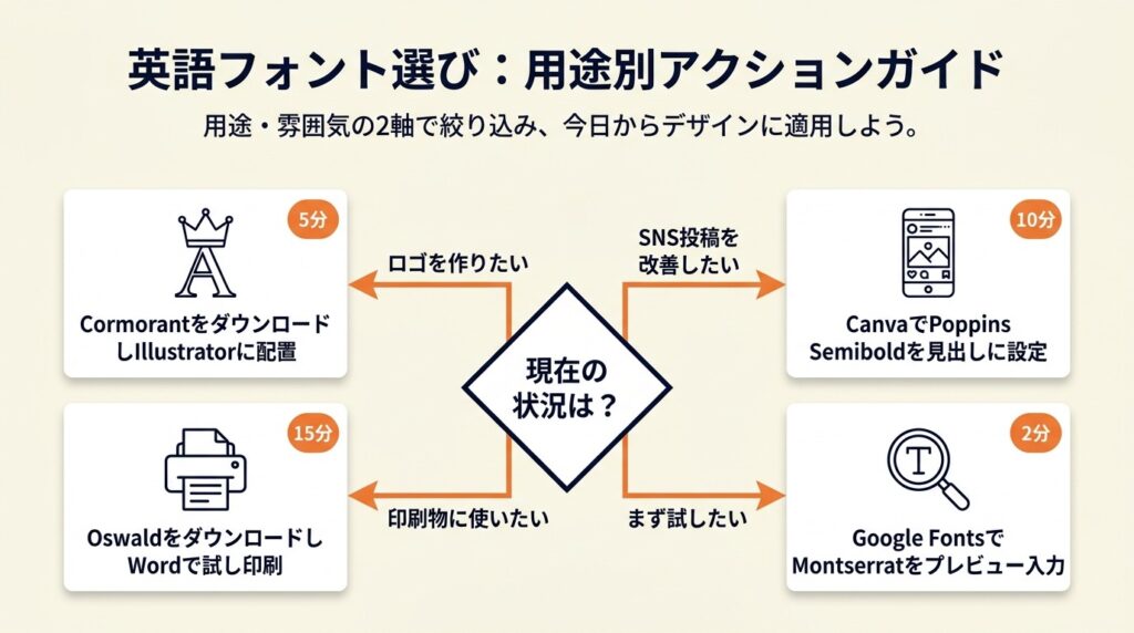 まず1つ選んでダウンロードし、今日作るデザインに適用することが最初の一歩です。本記事の診断フローと15選を手元においておくことで、次のフォント選びが格段に速くなります。