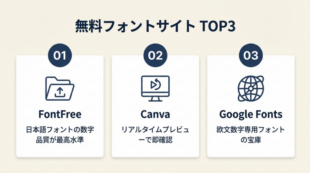 | 今すぐ無料DLしたい | 無料フォントサイト5選と数字品質 | 5分 |