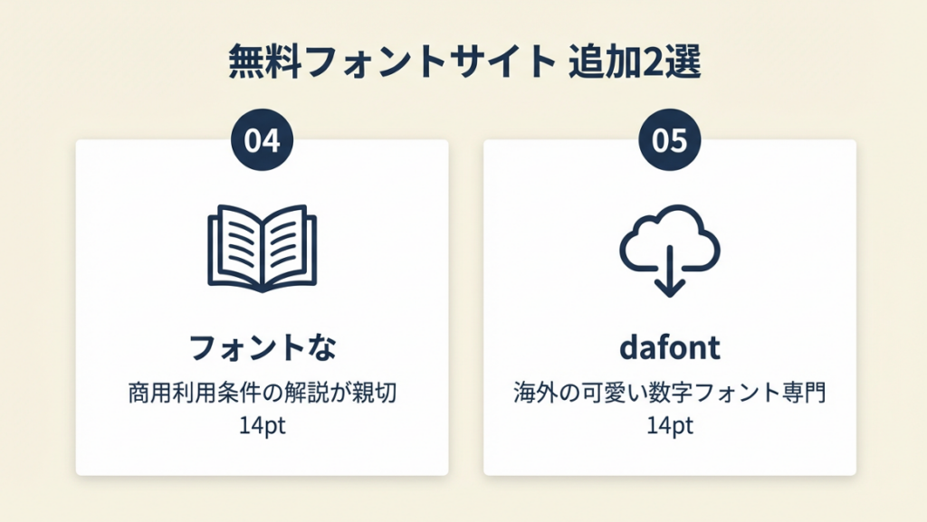 商用利用可フィルターを使えば、ライセンス確認の工数を削減できます。ただし、フィルターで「商用可」と表示されていても、各フォントの同梱readmeファイルで利用条件の詳細確認は必ず行ってください。ひらがなかわいいフォントもFontFreeで揃えると、数字との統一感がさらに高まります。