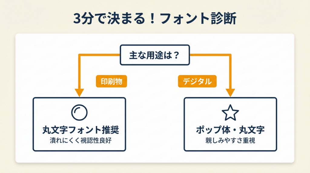 A: 「自分の業種のブランドイメージは親しみやすさ重視か、スタイリッシュ重視か」を二択で答えてください。親しみやすさ重視→丸文字・手書き風、スタイリッシュ重視→欧文系丸文字(NunitoやComfortaa)が基本の判断軸になります。