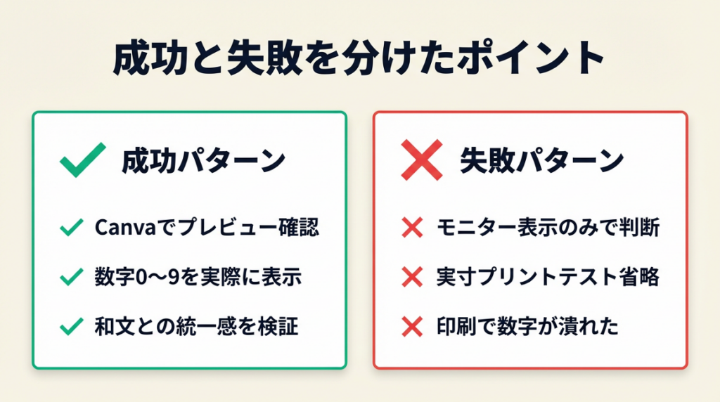 Canvaで数字「0123456789」を実際に確認してから採用する30秒の手間が成功の分岐点でした。事前プレビューなしでいきなり入稿していれば、数字部分の違和感が残ったまま公開されていました。