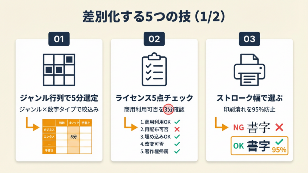 - 【ポイント】: 印刷用途ではストローク幅(細め/普通/太め)を先に確認することが重要です。手書き風フォントの中でも「ストロークが細い系」は12pt未満の印刷でほぼ必ず潰れるため、事前フィルタリングが実務では必須です。名刺にフォントを使う際はフリーランスの名刺デザイン活用術も参考になります。