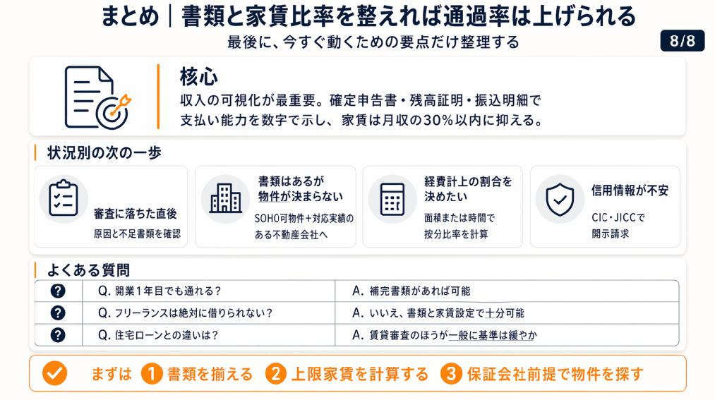 まとめ:フリーランス賃貸は書類と家賃比率で決まる