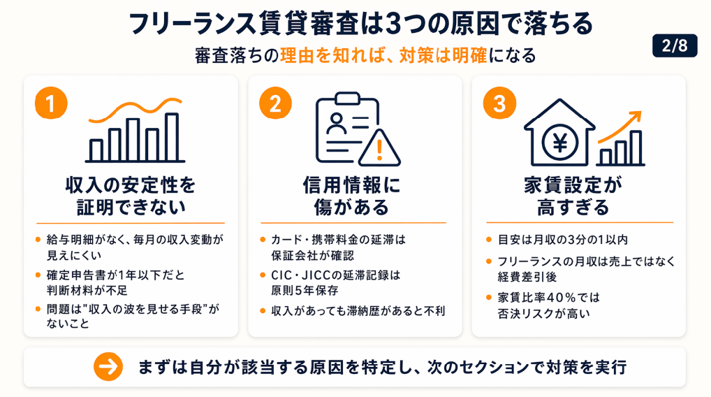 A: 信用情報の傷(滞納歴)が影響します。収入証明や家賃比率は書類や物件変更で対応できますが、信用情報はCIC・JICCで5年間記録が残るため、事前確認が重要です。