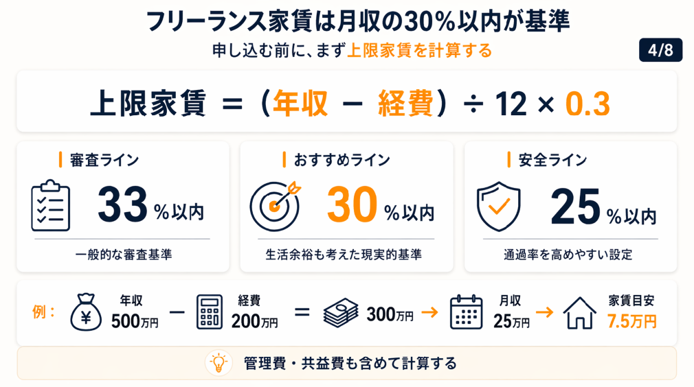 フリーランスの月収計算では、年間売上から年間経費を差し引いた金額を12で割った値を使います。年収500万円でも経費が200万円あれば、月収換算は約25万円となり、審査上の上限家賃は約8.3万円(33%)が目安です。この計算を事前にしておかないと、希望する家賃が審査基準を超えていることに気づかないまま申込を繰り返すことになります(賃貸スタイル:フリーランスの賃貸審査完全ガイド)。