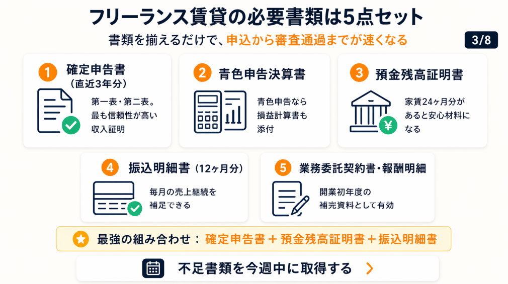 クライアント名が振込人として記録されている場合は、業務委託の継続性を示す証拠にもなります。「確定申告書2年分+振込明細12ヶ月分」の組み合わせは、開業初年度のフリーランスにとって現実的な書類構成です(レバテックフリーランス:賃貸契約の審査に通るには)。