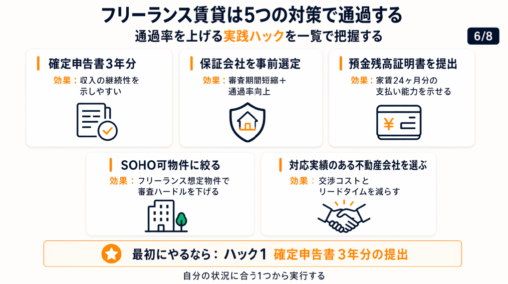 [コツ]: 「フリーランスに審査実績がある保証会社を不動産会社に提案する」アプローチを取ります。交渉の余地がある場合は積極的に希望を伝えてください。