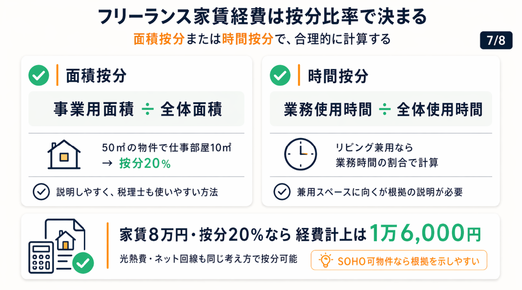 面積按分では「事業に使用している部屋の面積÷物件全体の面積」で計算します。50㎡の物件で仕事専用として使っている部屋が10㎡の場合、按分比率は20%となり、月額家賃8万円のうち1万6,000円が経費計上できます。見落としがちですが、仕事とプライベートを兼用している部屋は「業務使用時間の割合」で按分することが原則であり、100%を経費計上することはできません。