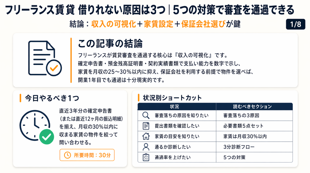 フリーランスの賃貸審査を通過する核心は「収入の可視化」です。確定申告書3年分・預金残高証明書・振込明細書の3点セットで支払い能力を数字で示し、家賃を月収の3分の1(約33%)以内、できれば30%以内に設定することが確実な通過策です。審査基準は不動産会社や保証会社によって異なりますが、書類と家賃比率の2点を正しく整えれば、開業1年目でも審査通過は現実的な目標です。
