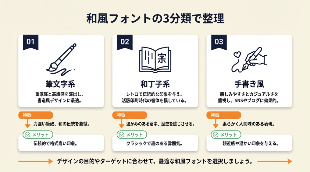 和風フォントを探すとき、「種類が多すぎて選べない」と感じることがあります。実は、和風フォントは大きく3つのカテゴリに分類できます。この分類を知っておくだけで、フォント探しの効率がぐっと上がります。