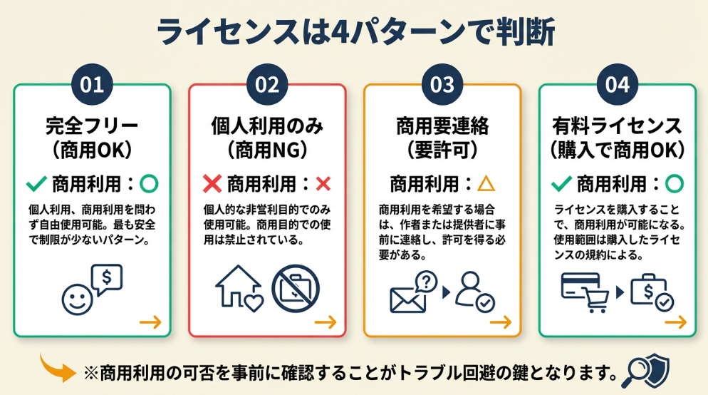 フォントを使う際に最も気になるのが商用利用の可否です。ライセンス確認を怠ると、後からトラブルになりかねません。ここでは、ライセンスの種類と確認方法を解説します。