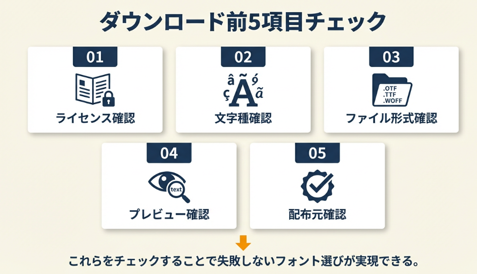 フォントをダウンロードする前に確認すべきポイントを5項目にまとめました。このチェックリストを参考に、失敗しないフォント選びを実践してください。