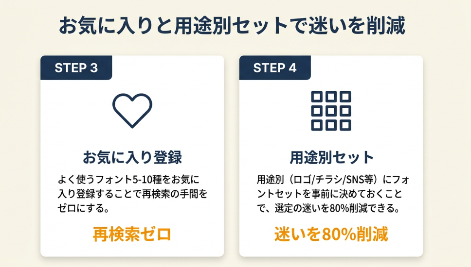 フォント選びで時間がかかる原因は「選択肢が多すぎること」です。お気に入りを登録しておけば、まず定番から検討し、必要に応じて拡張するという効率的なワークフローが実現します。