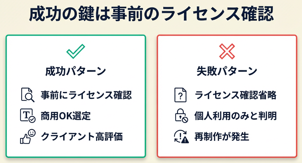 分岐点 ライセンス確認を怠っていたら、納品後に「商用不可フォントだった」と判明し、やり直しになっていました。