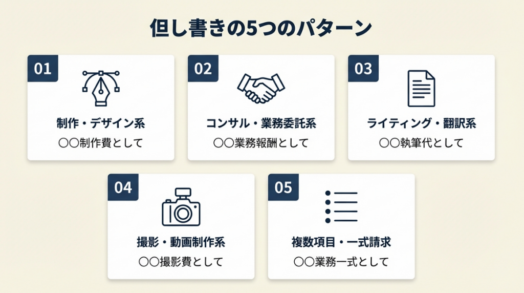請求書の但し書きは「〇〇業務代として」という形式で業務内容を一言で示すのが基本です。法的必須ではありませんが、但し書きがないと取引先の経理部門で処理できず支払いが遅延する原因になります。業種や取引内容に合わせた5パターンの文例を参考に、契約書の記載名と一致させた形で記入することが支払いトラブルを防ぐ最短の方法です。