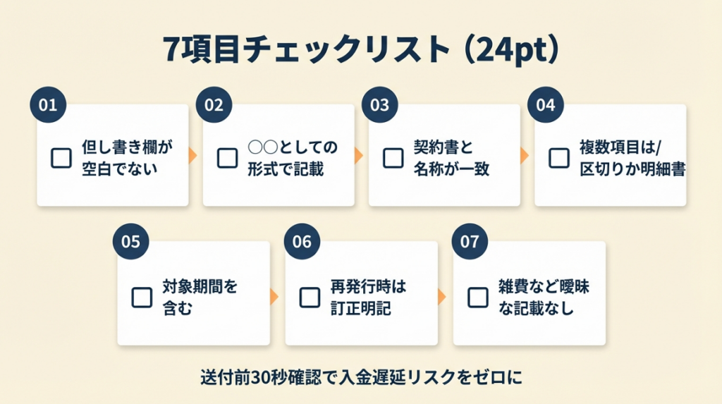 請求書を送る前に以下の7項目を確認することで、但し書きに関するトラブルをほぼゼロにできます。