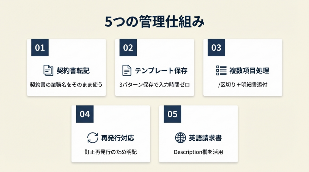 コツ: 「業務名は請求書用に言い換える」と考えがちだが、「契約書の業務名をそのまま転記する」ことで、取引先が照合に使う書類と一致し確認作業がゼロになります。
