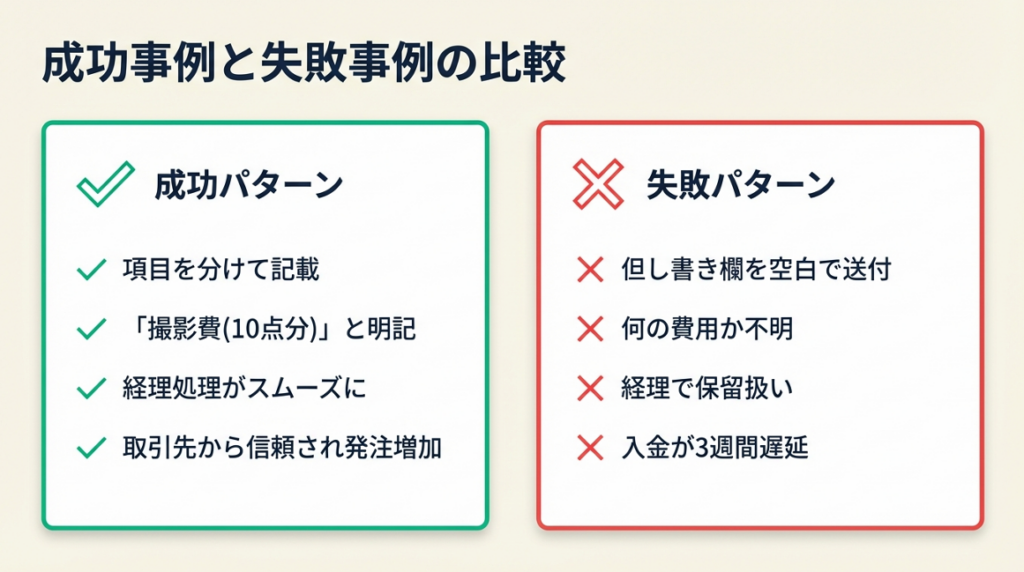 フリーランスデザイナーのAさんは、これまで「撮影代一式として」とまとめて請求していたが、ある月から「コーポレートサイト用写真撮影費として(商品10点分)」「画像レタッチ費として(10点分)」と項目を分割して記載するようにしました。すると、取引先の担当者から「明細が明確で経理に通しやすくなった」と連絡が入り、翌月からは発注量が増加しました。