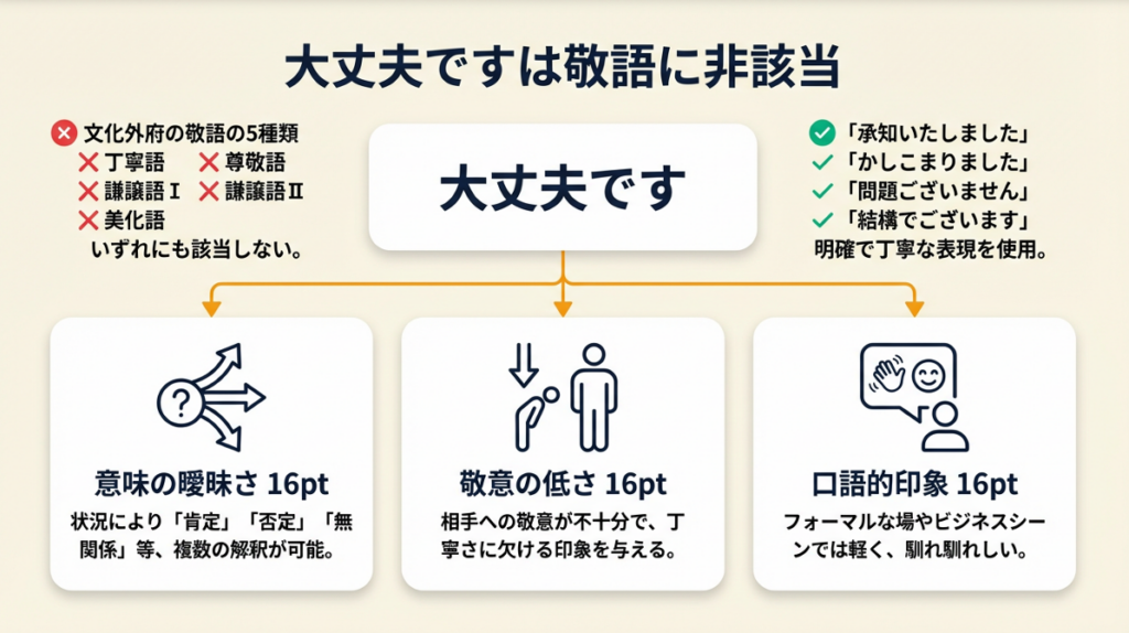 文化庁「敬語の指針(文化審議会答申)」では、敬語を「丁寧語・尊敬語・謙譲語(I・II)・美化語」の5分類に整理しています。「大丈夫です」の「です」は丁寧語の助動詞に見えますが、「大丈夫」という語自体は話し言葉(口語)の形容動詞であり、相手への敬意を直接表す機能を持ちません。つまり「丁寧な形式で言った口語表現」にすぎず、ビジネス敬語として機能しないとされています。