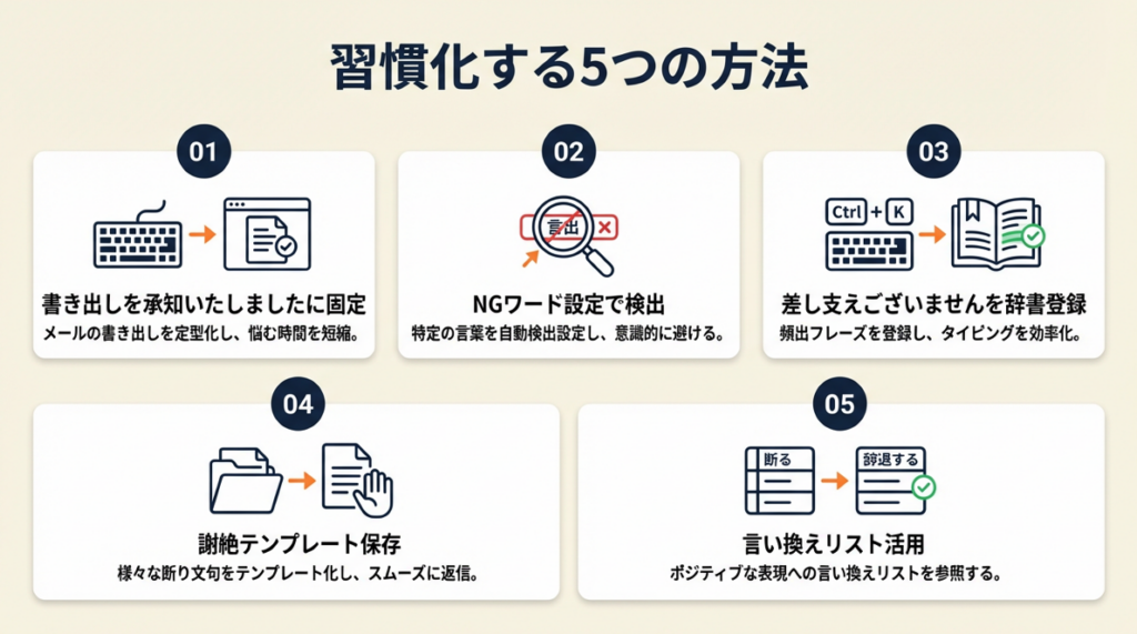| 実践ノウハウを5つまとめて知りたい | 大丈夫ですの言い換えは5つの習慣で定着 | 10分 |