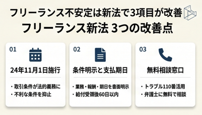 フリーランス不安定は新法で3項目が改善