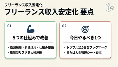 フリーランスの収入不安定は、構造的な原因を把握し、新法を活用し、5つの仕組みを順番に整えることで改善できます。