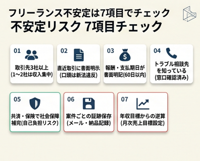 | すぐ行動できる手順を知りたい | フリーランス不安定は7項目でチェック | 3分 |
