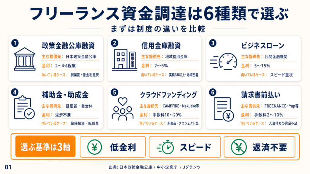 フリーランスが利用できる主な資金調達手段は以下の6種類です。それぞれに向いているケースが異なるため、状況に応じた選択が審査通過の前提になります。