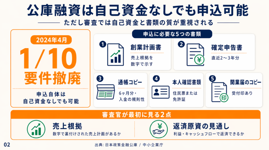 制度上の自己資金要件(総額の1/10以上)は撤廃されており、自己資金が少なくても申込自体は可能です。ただし、審査では自己資金の多寡が「事業への本気度・返済の確実性」の評価材料として引き続き重視されています。「自己資金がないから無理」ではなく、「自己資金の実態と計画の信頼性をどう示すか」が先決です。