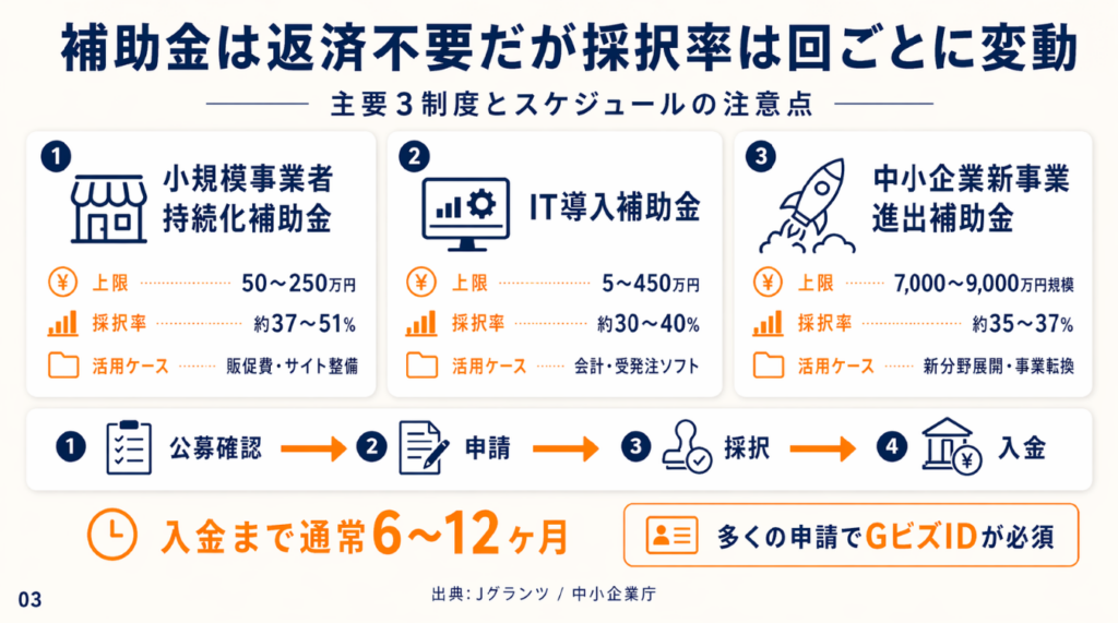 補助金は返済が不要という点で魅力的ですが、「申請すれば必ずもらえる」という誤解が申請失敗の大きな原因です。競争率のある審査制度であり、計画性のある準備が不可欠です。