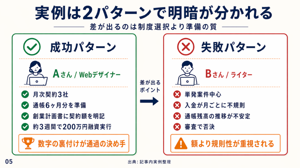 Webデザイナーとして開業1年目のAさんは、クライアント3社との月次契約書と半年分の通帳を揃え、創業計画書に契約額の実績一覧を添付した状態で日本政策金融公庫に申込しました。面談では「既存契約の継続性」を重点的に説明し、申込から約3週間で200万円の融資が実行されました。