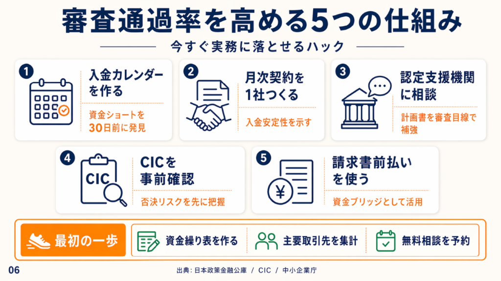 以下の5つのハックは、審査通過率を高めるために実務で効果が確認されているアプローチです。